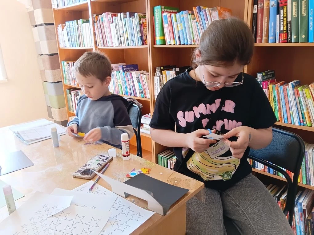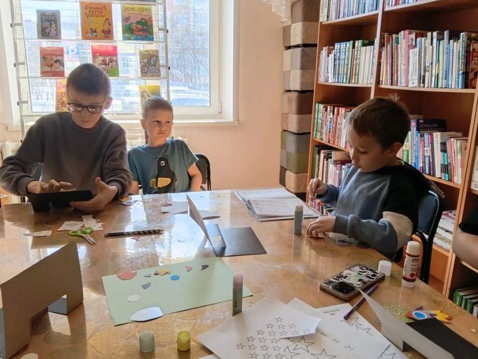 Ребята с любопытством слушали, задавали вопросы и обсуждали мечты о космических путешествиях. Затем наступило время практики. Каждый ребенок получил картон, ножницы и клей. Задача состояла в создании собственных ракет. Под руководством библиотекаря дети вырезали детали, собирали корпуса и декорировали модели. Атмосфера наполнилась смехом и креативом — каждый стремился сделать ракету уникальной.