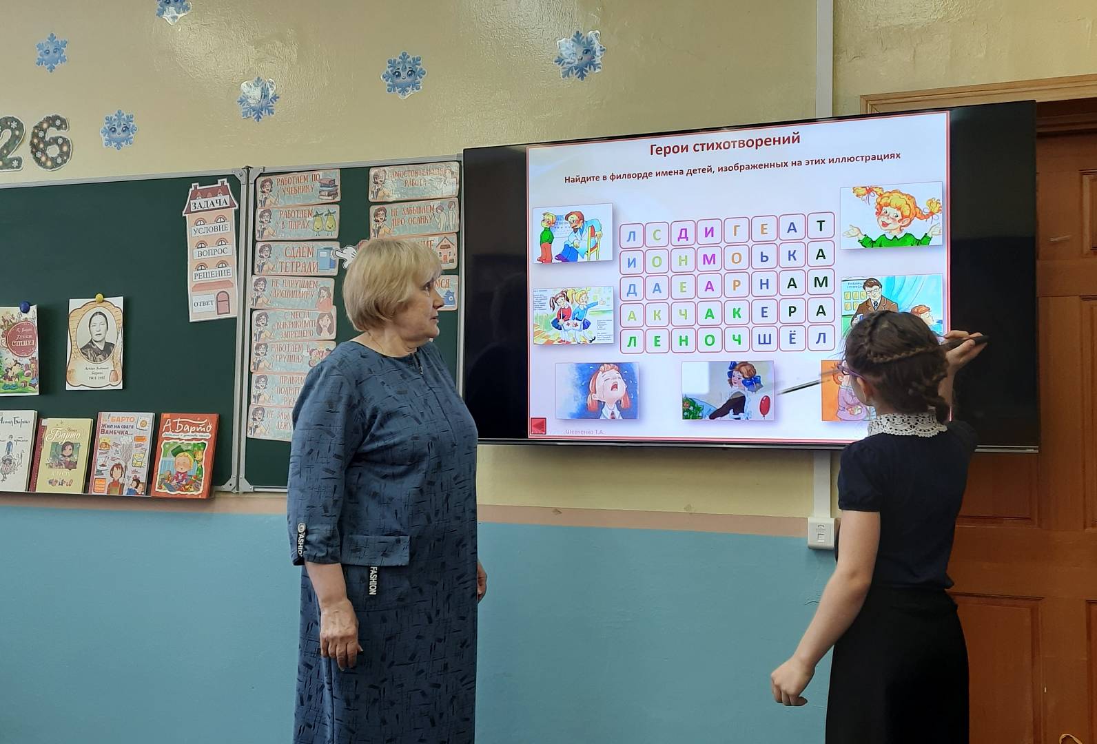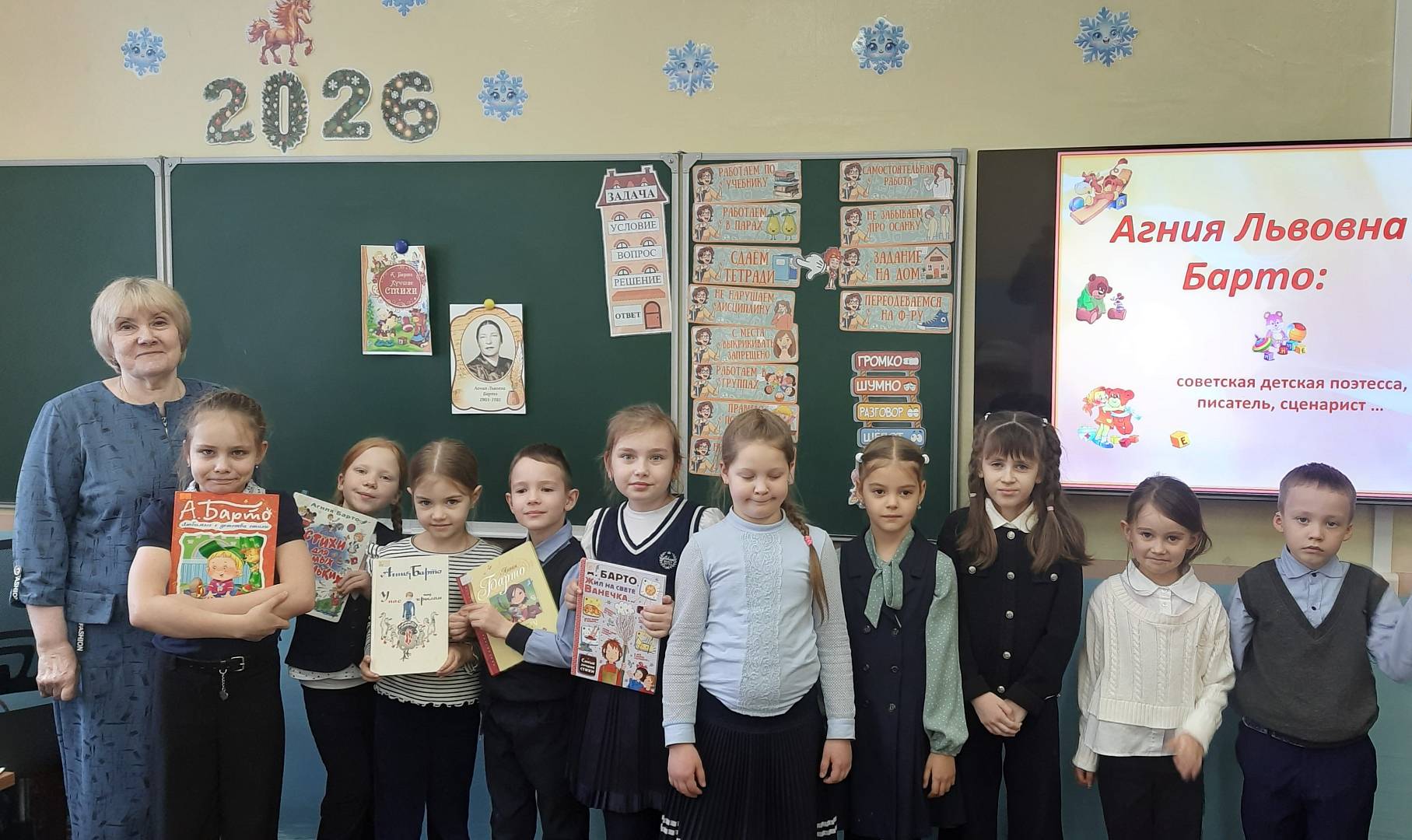 Для учащихся начальных классов гимназии № 13 прошел библиотечный час «Любимые стихи Агнии Барто». Библиотекарь модельной ЦГБ им. О. Куваева с помощью презентации «В стране веселого детства» познакомила детей с жизнью и творчеством поэтессы. Дети вспоминали стихи и поиграли в игру «Продолжи строчку», поучаствовали в викторине «Игрушки», «Угадай - ка», где ребята по отрывкам произведений Агнии Львовны угадывали его название, собирали из букв названия стихотворений. Все отлично справились со всеми заданиями.