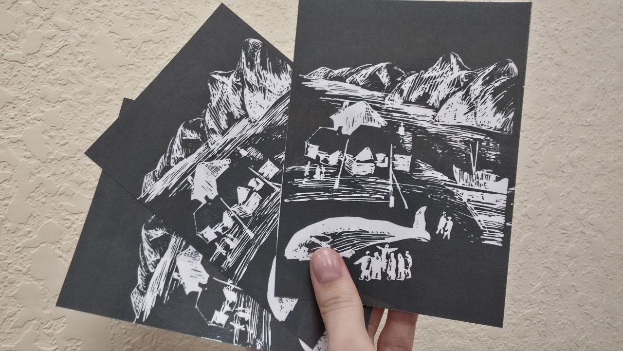 Работая резцом по линолеуму, участники переносили на бумагу ключевые образы севера:
