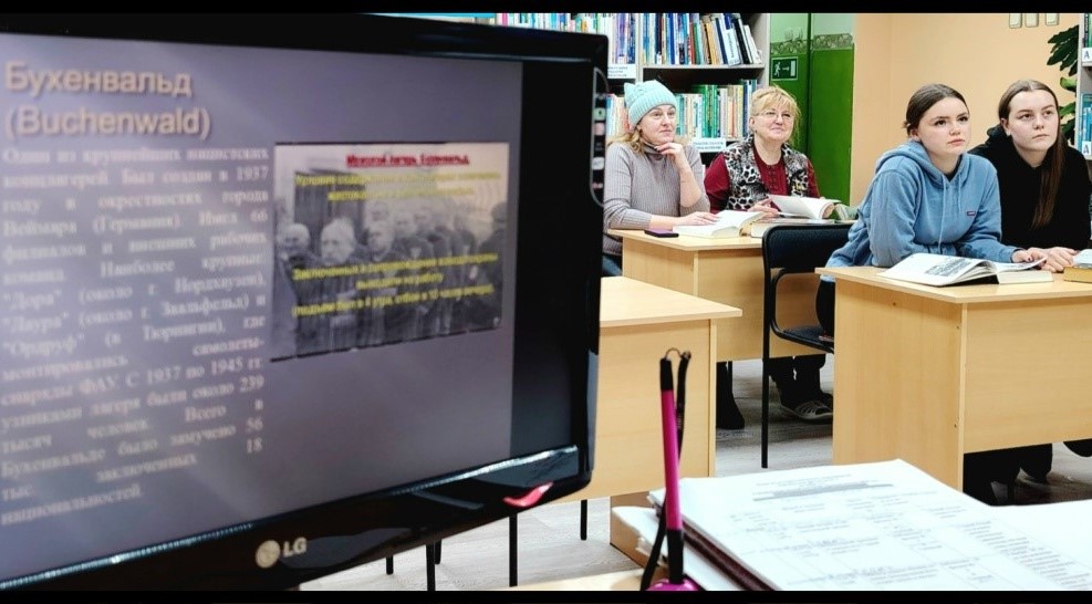 На уроке рассмотрели причины, ход и последствия Холокоста. Участники посмотрели видео из тематического документального цикла, где показаны ужасы лагерей Освенцим, Майданек и Дахау, а также презентацию «Фашистские лагеря в годы войны».