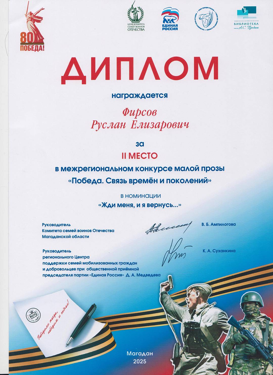 10 мая в рамках фестиваля «Победный май», приуроченного к Году защитника Отечества и 80-летию Победы в Великой Отечественной войне, состоялось подведение итогов межрегионального конкурса малой прозы «Победа. Связь времён и поколений». Призовым дипломом за II место в номинации «Жди меня, и я вернусь…» был награждён Руслан Фирсов, заведующий информационным центром МБУК г. Магадана ЦБС, председатель Магаданского отделения СМЛ СПР. Автор был отмечен за рассказ с символическим названием «Жди меня, и я вернусь…».