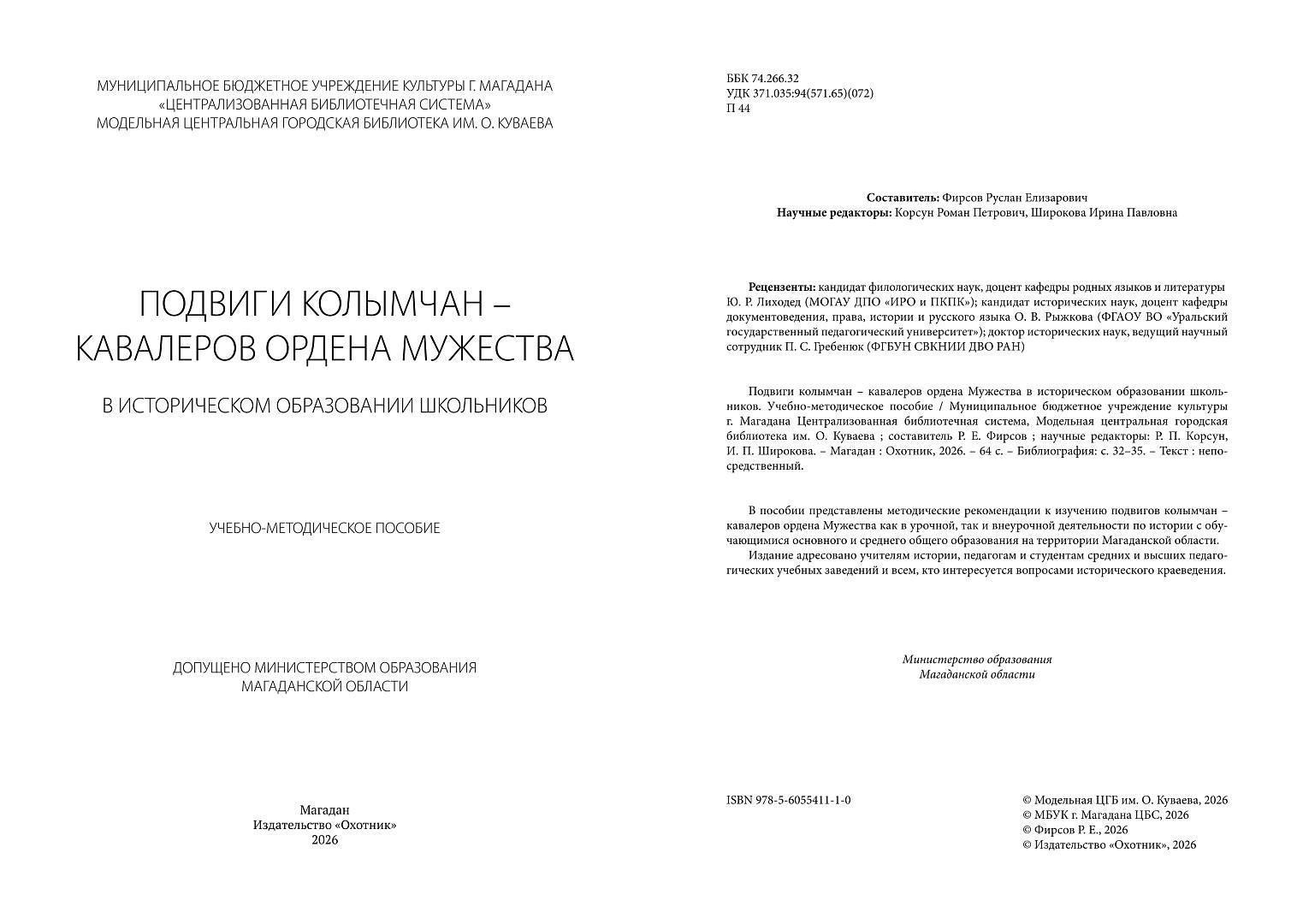 Модельная Центральная городская библиотека имени О. Куваева в издательстве «Охотник» выпустила учебно-методическое пособие «Подвиги колымчан – кавалеров ордена Мужества в историческом образовании школьников». Составителем издания выступил заведующий информационным центром МБУК г. Магадана ЦБС Руслан Фирсов. Научными редакторами стали Р. П. Корсун и И. П. Широкова.