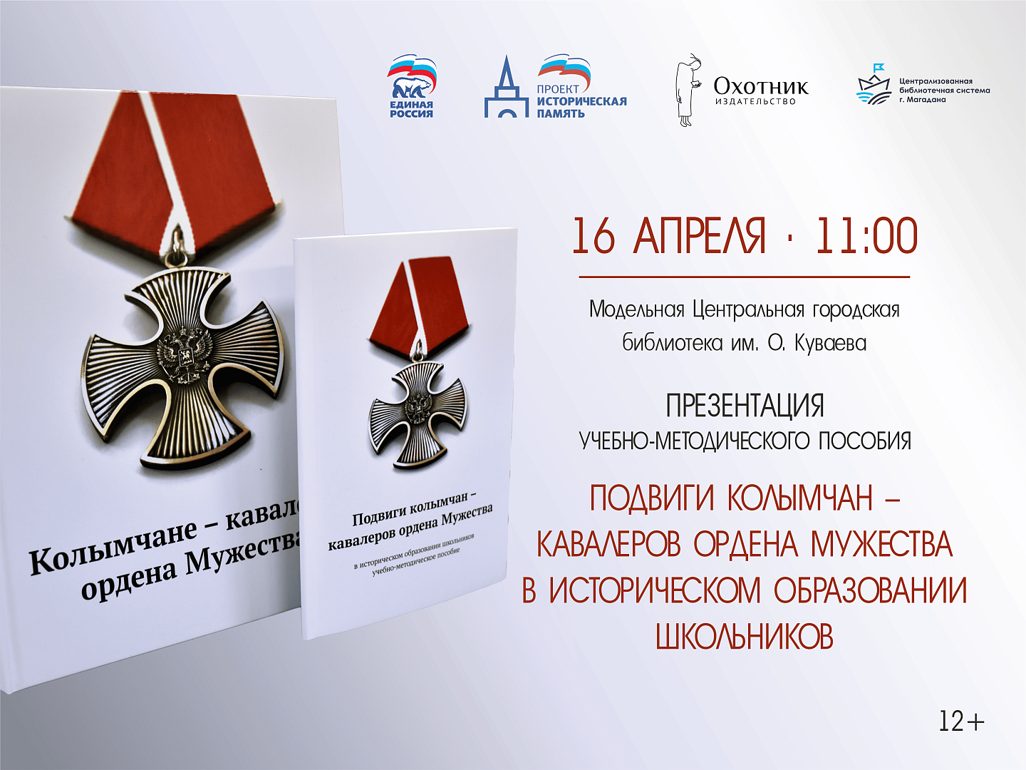 Рады сообщить, что 16 апреля в 11:00 в модельной Центральной городской библиотеке им. О. Куваева (Новая 29В) состоится презентация учебно-методического пособия «Подвиги колымчан – кавалеров ордена Мужества в историческом образовании школьников».