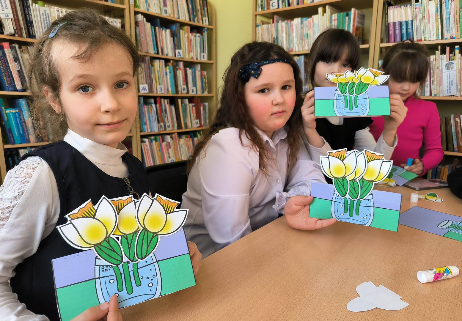 Завершился визит в библиотеку творческой мастерской, где каждый ученик смог создать оригинальную поделку к Международному женскому дню — 8 марта. Дети с удовольствием вырезали, клеили и раскрашивали, создавая особенные подарки для мам, бабушек и учителей.