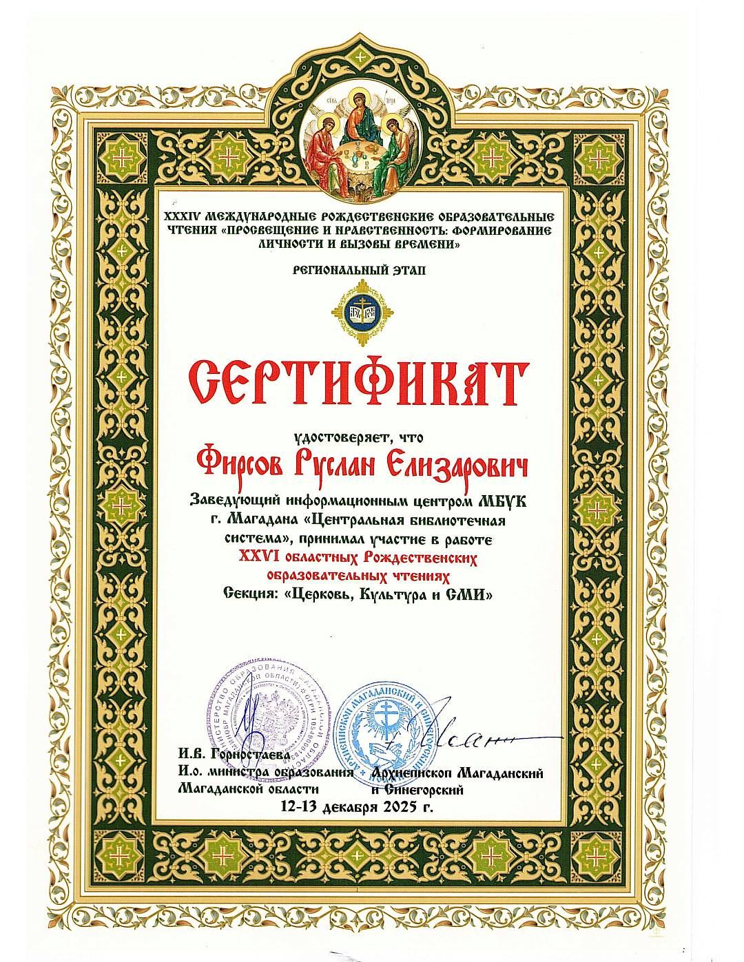 12-13 декабря в Магадане прошли XXVI областные Рождественские образовательные чтения «Просвещение и нравственность: формирование личности и вызовы времени». В рамках Секционного заседания – «Церковь, культура и СМИ» – с докладом выступил заведующий информационным центром Централизованной библиотечной системы г. Магадана Руслан Фирсов.